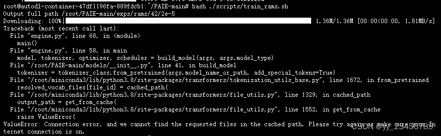 ValueError: Connection error, and we cannot find the requested files in the cached path. Please try 之前都能正常执行,这两天突然出现这种错误,试过重新上传模型导入依赖,还是无法解决。' 加载预训练模型时,连接失败。