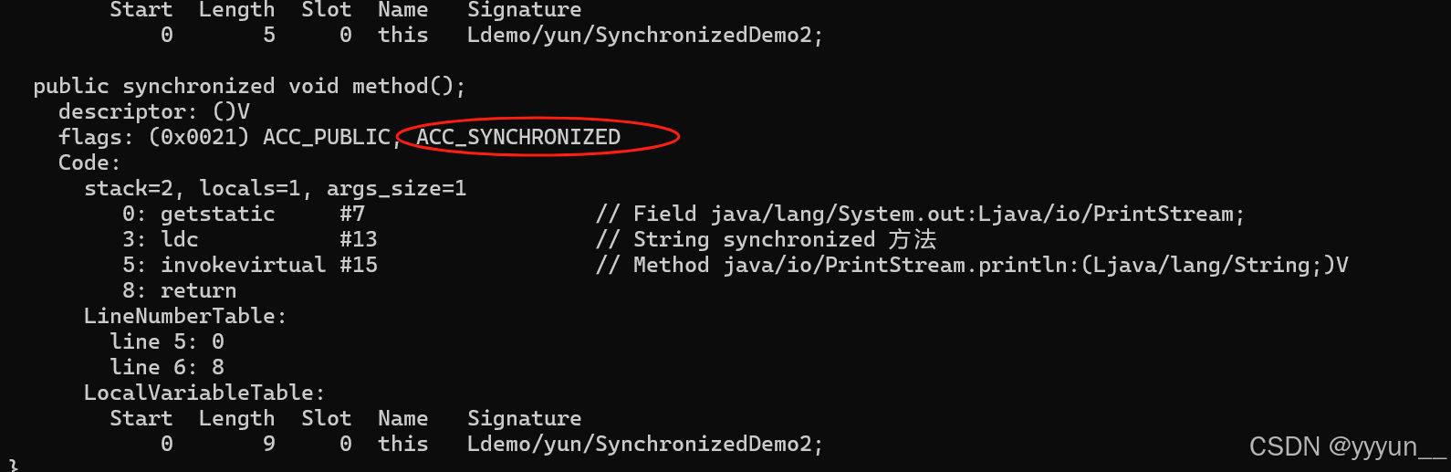 synchronized 修饰的方法并没有 monitorenter 指令和 monitorexit 指令,而是 ACC_SYNCHRONIZED 标识,该标识指明了该方法是一个同步方法。JVM 通过该 ACC_SYNCHRONIZED 访问标志来辨别一个方法是否声明为同步方法,从而执行相应的同步调用。