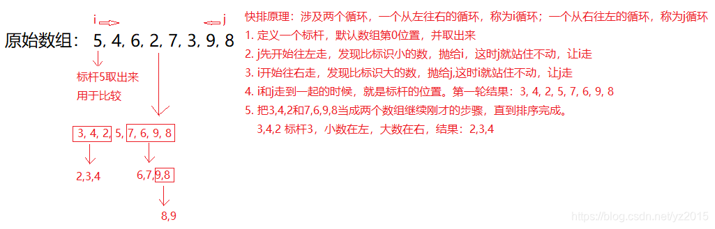 1. 定义一个标杆,初始标杆为数组第0个位置,把标杆取出来放到外面。标杆作用:比标杆小的数字放到标杆左边,比标杆大的数字放到标杆右边。