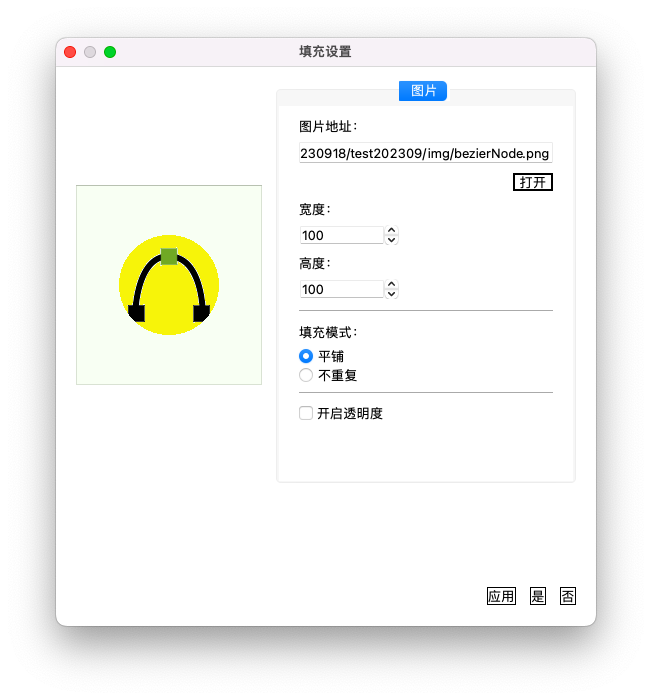 Qt::填充样式-填充图片-setTexture 本软件采用QBrush的setTexture()方式实现图片填充,其中图片路径需要自己设置,图片大小也可设置,若开启透明度,将图片透明像素填充为设置的填充颜色即可。