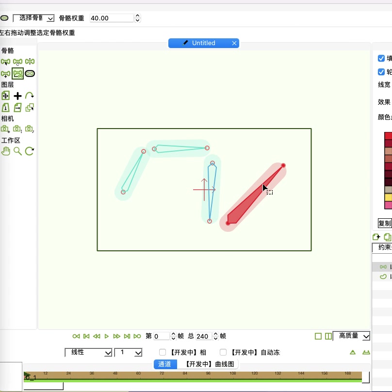 Qt::骨骼框架-骨骼权重-setStrength 通过设置每个骨骼权重,对所有骨骼相对大小进行计算,同时结合骨骼与节点间的相对位移,得到每个骨骼对每个节点的影响权重,进而实现当骨骼变换时,节点跟随发生相应变换。