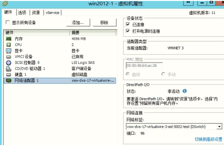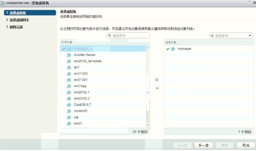 点击【coreserver_sw】 逻辑交换机, 点击红框中的图标, 分别把虚拟机连接到相应逻辑交换机中。