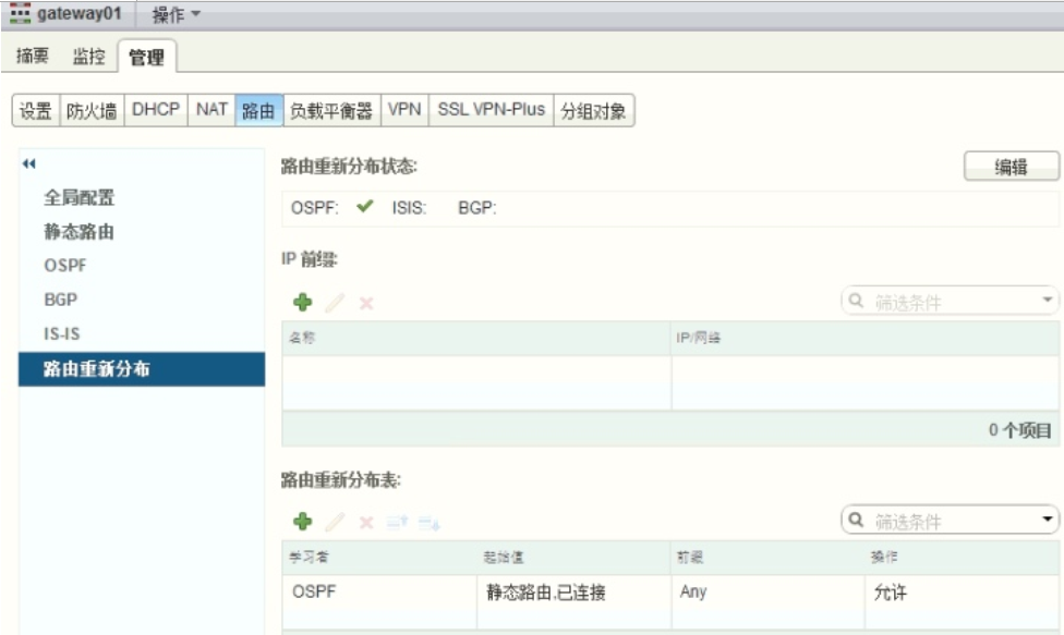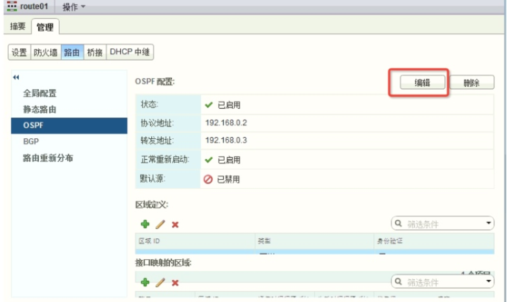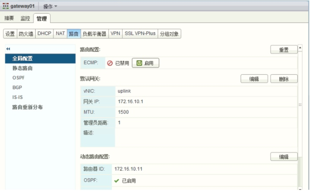 需要通过配置 OSPF 协议的方式进行互联。 点击 DLR【管理】 , 点击【路由】 【全局配 置】 , 右侧点击【编辑】