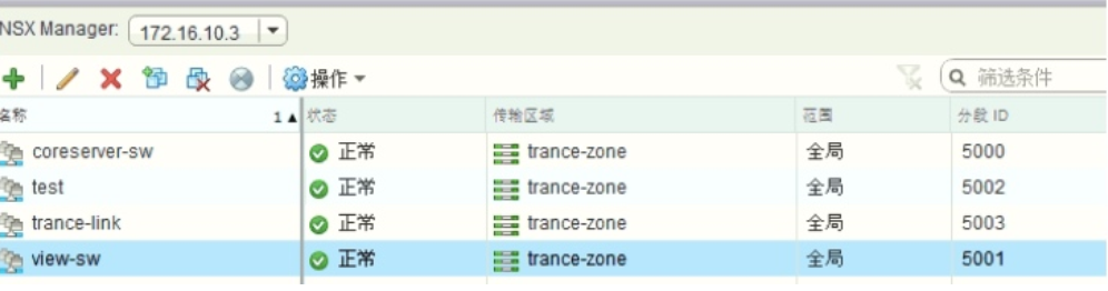 创建一个名为【view_sw】 的逻辑交换机, 同样的方法分别创建【coreserver_sw】 【test】 【trance-link】