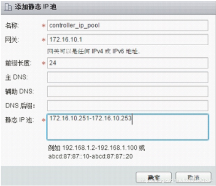 在【IP 池】 右侧点击【选择】 , 为 NSX 控制器创建 IP 地址池, 此地址池是正常访问 地址段即可。