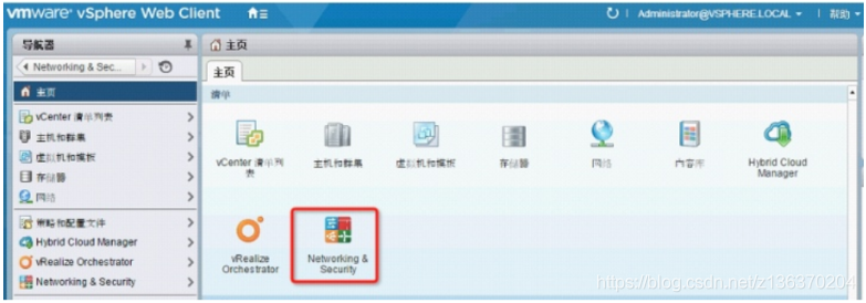 1、 用浏览器打开 vsphere web client, 连接 vCenter Server, 点击【Networking & Security】 , 进入管理界面。