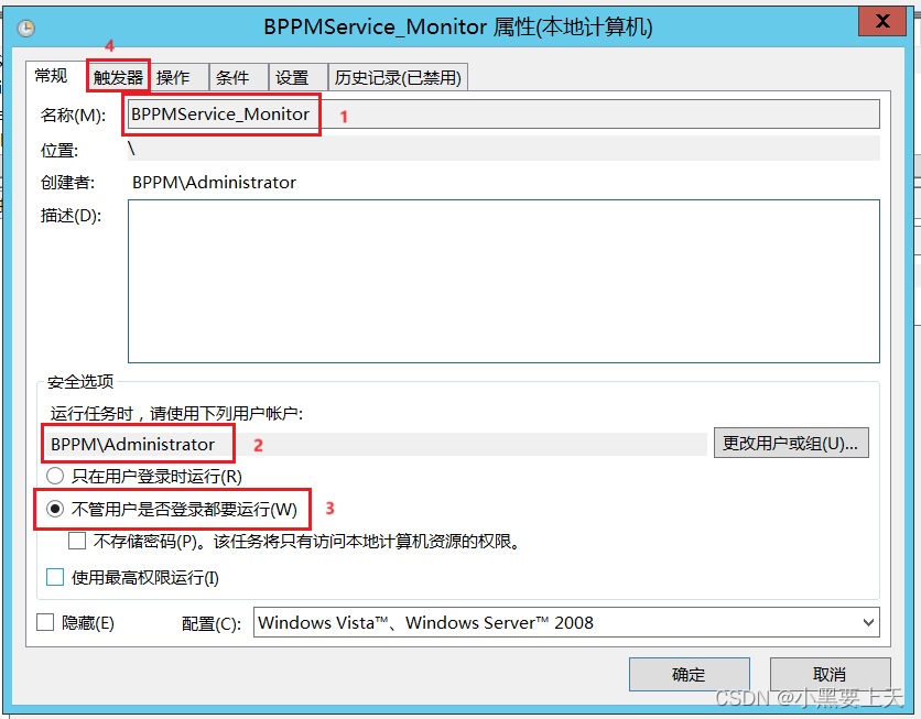3.在弹出的“创建任务”对话框中,输入任务名称,设定运行任务时,使用的用户账户等信息;点击“触发器”选项