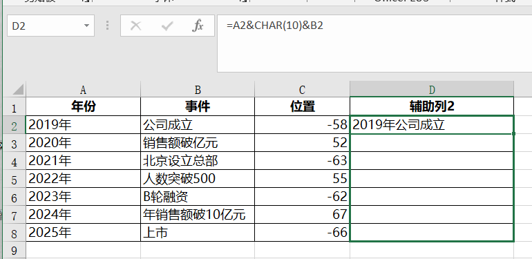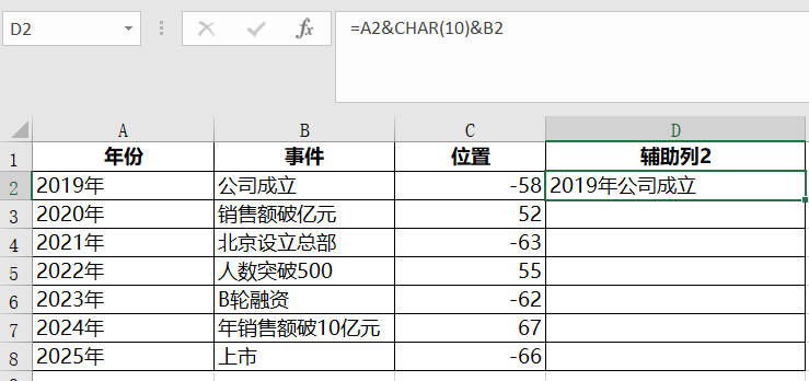 "辅助列2"类中的值为=A2&CHAR(10)&B2,点击单元格右下角"+"下拉即可完成剩余填充