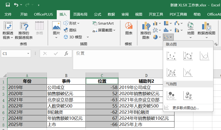 2.按Ctrl键,选择A1-A8、C1-C8,点击"插入"菜单,选择"散点图",即可插入散点图。