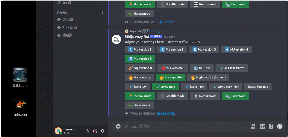 使用"/blend"命令,您可以上传一张空鱼缸的图片和一张金鱼的图片,然后生成一张带有鱼的鱼缸图片。