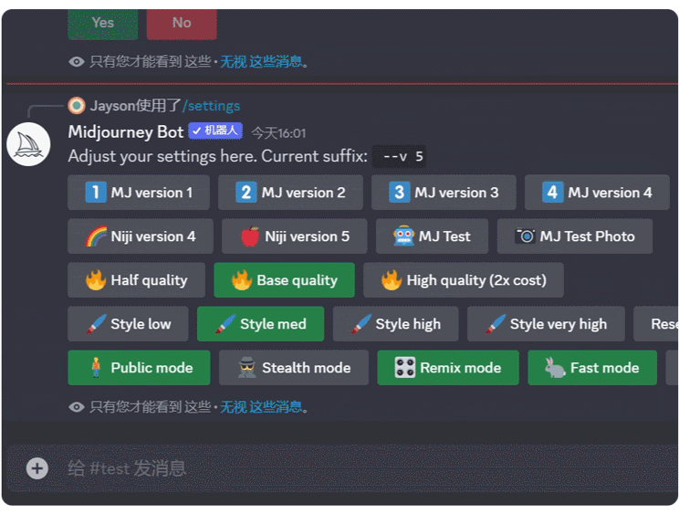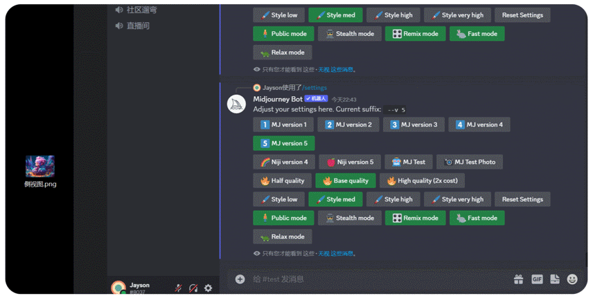使用 niji 5,输入 /settings 回车(注意要选择绿色图标的)。