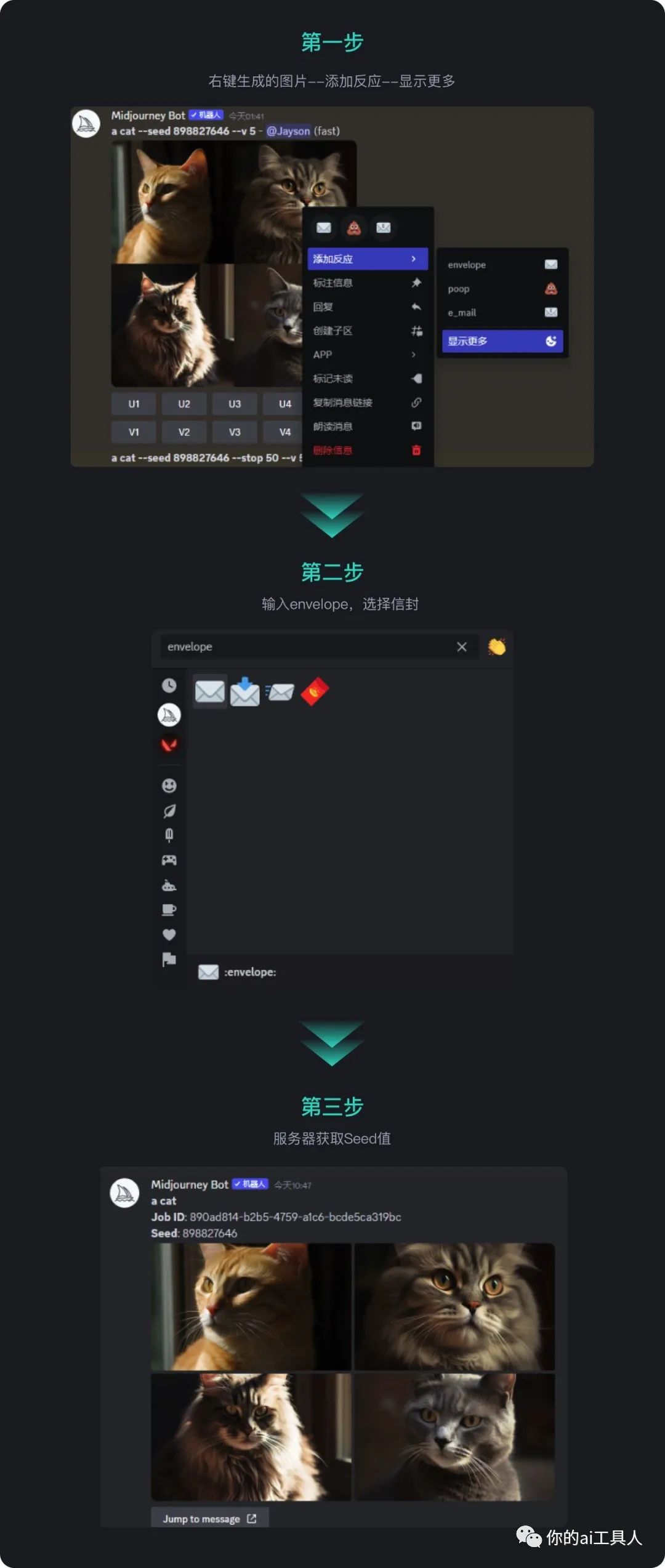通过这个简单的步骤,你可以轻松添加反应,并在 Midjourney 私聊中获取种子值。这样,你可以与其他人分享相同的种子值,以获得相似的图片生成结果。