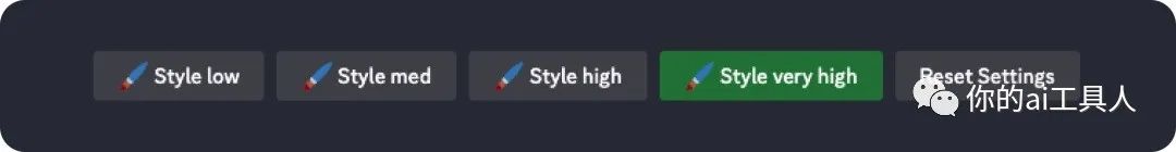 "Style" 参数中的 "low"、"med"、"high" 和 "very high" 分别代表着艺术风格化的程度,从低到高分别对应着不同的水平。而 "Reset Settings" 则是用于重置设置,将参数恢复到默认状态。