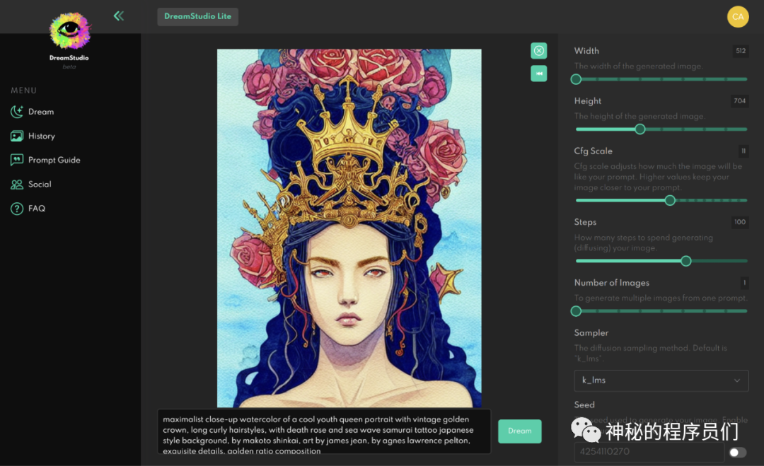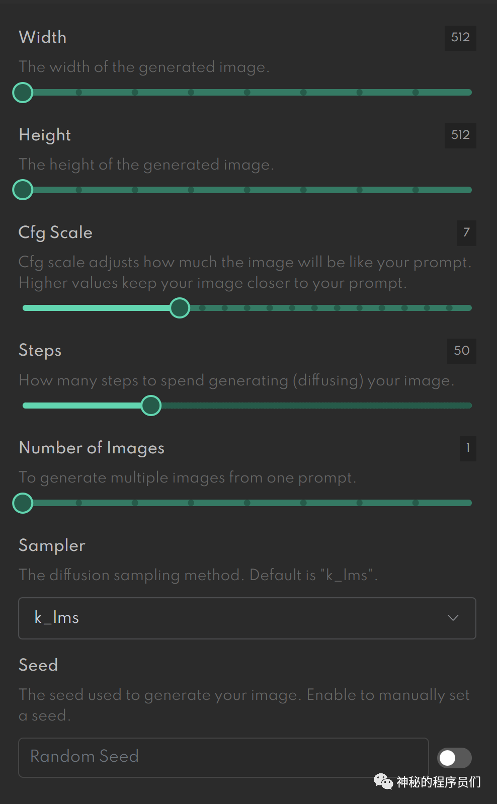 不像 Disco Diffusion 需要掌握对 20~30 个参数的学习和实践运用,SD 只提供了 7 个可设置的参数,非常简单。