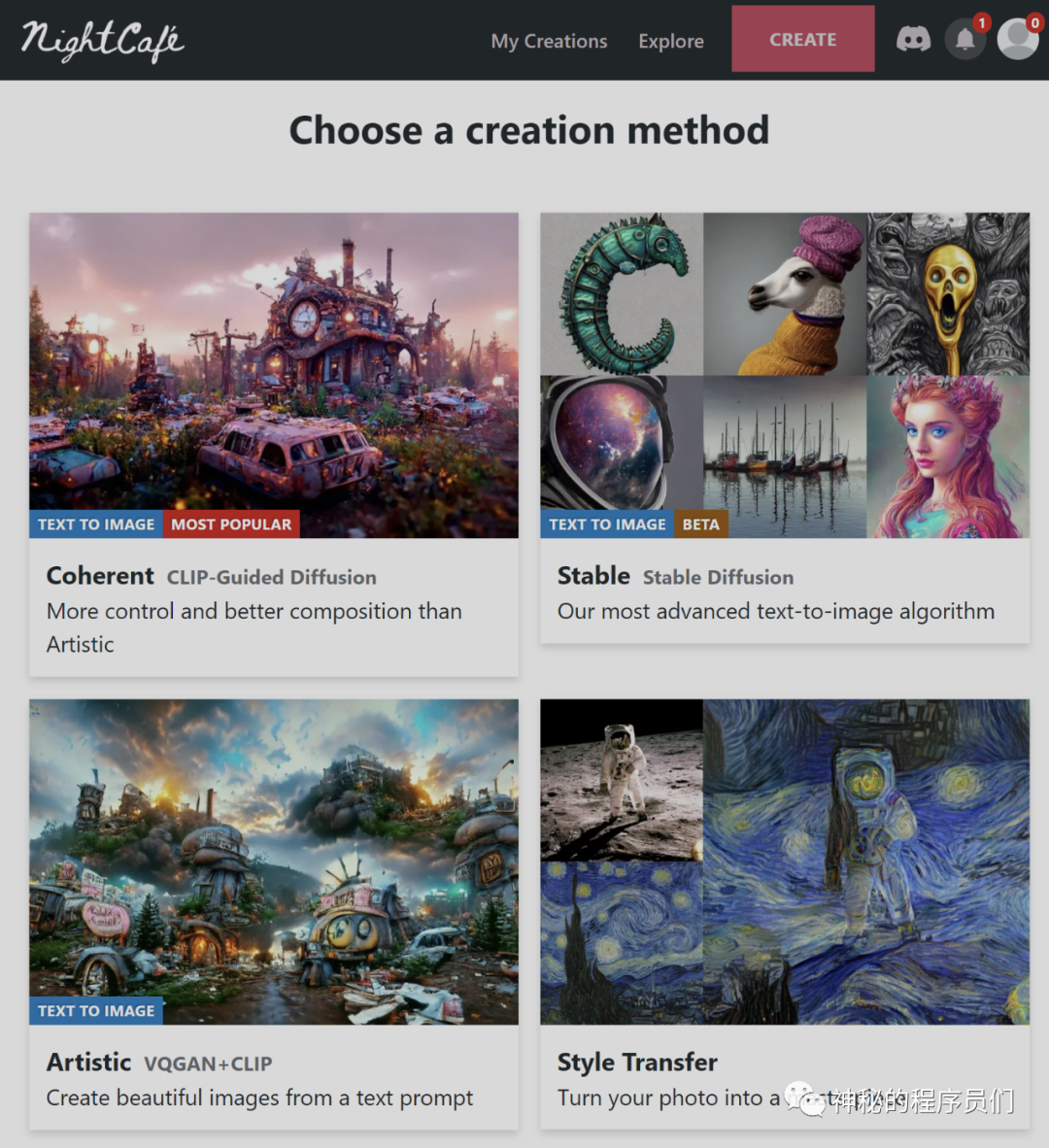 接口和应用: AI 图像生成应用中的前辈 NightCafe.studio 刚刚已经接入了 Stable Diffuion ,用户可以在 DD、SD、VQGAN 和 风格迁移 这几大类模型中四选一。