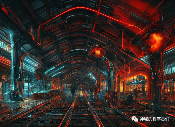 Hyper detailed painting of a cyberpunk cyberpunk cyberpunk TRAIN STATION, epic angle , ribcage skeleton symmetrical artwork, Hell of fire,3d with depth of field, blurred background, translucent, nautilus, energy flows of water and fire. a highly detailed epic cinematic concept art CG render. made in Maya, Blender and Photoshop, octane render, excellent composition, cinematic dystopian brutalist atmosphere, dynamic dramatic cinematic lighting, aesthetic, very inspirational, arthouse. y Greg Rutkowski, Ilya Kuvshinov, by James Jean and dan mumford (匿名高手作品)