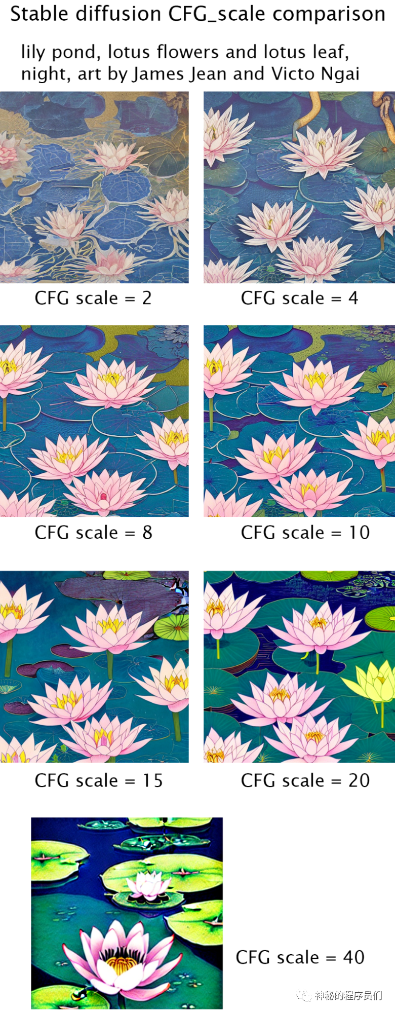 CFG scale,**类似 DD 里的 CGS 参数。**越高的数值会让生成结果跟 prompt 匹配度更高,同时也会让结果图片的饱和度和对比度更高,颜色更平滑,纹理更少。但高于 20 后会出现不良效果。