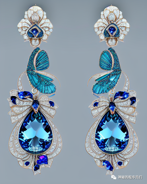 full display of baroque style jewelry design, a pair of earrings, blue gemstones with different saturation winged butterflies and pear shaped diamonds, roses sharp, highly detailed vray render, flash (匿名高手作品)