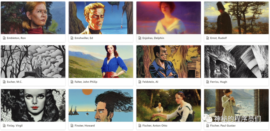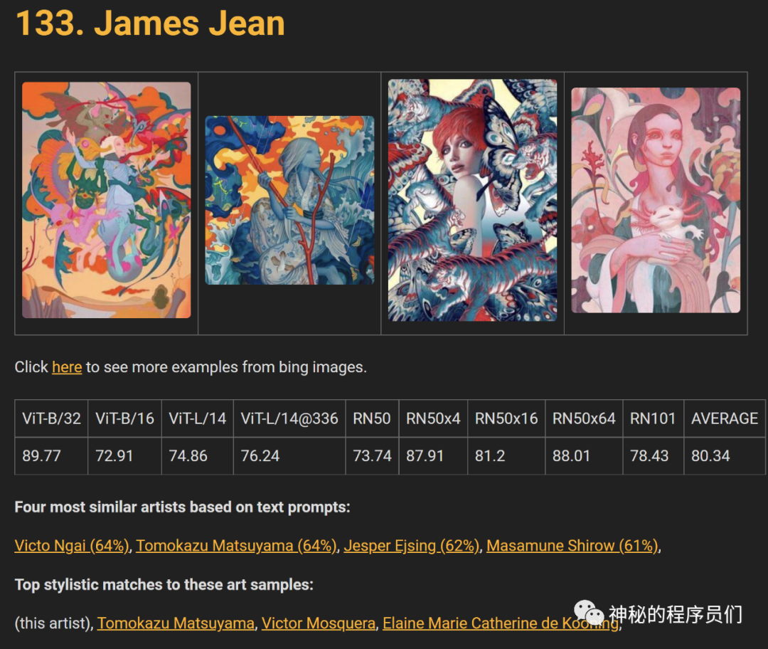 CLIP Ranked Artists —— ProgRockDiffusion 的开发者 Jason Hough @LowFuel 的项目,列出了各艺术家在 CLIP 各模型里的的感应度评分,以及相似艺术家。