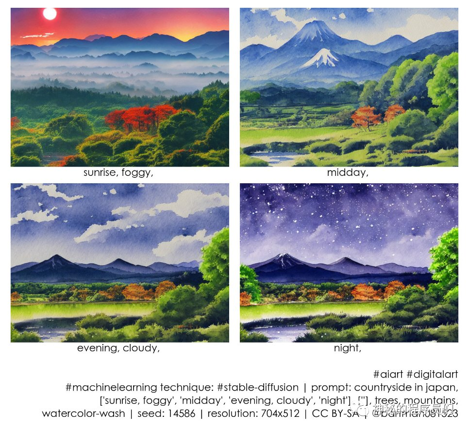 @bartman081523 使用同一个种子 14586 生成的一组图片,每张轻微替换了 prompt 中的一两个关键字。实验结果很明显,锁定一个种子后再调整 prompt,可以保持构图、布局大致相同,在细节和色调上带来变化。