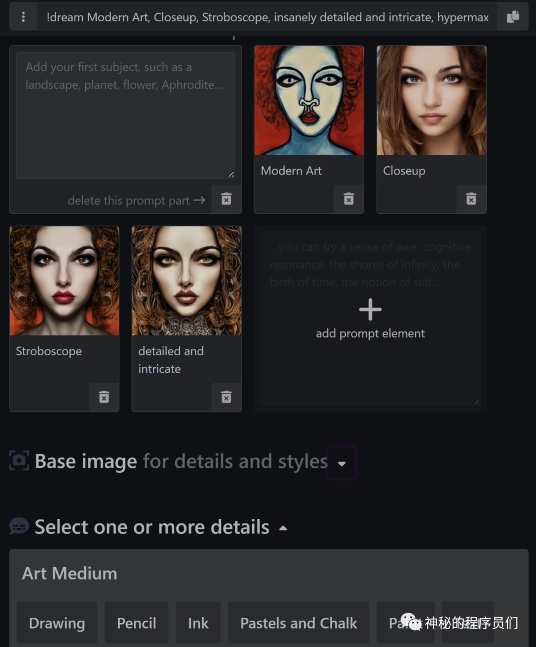 Prompt 构建器 —— 写 prompt 词汇量不够?想不出来更具体地描述一个对象?这个应用把多个维度的修饰词做成了一个个带 demo 效果图的可点按钮,只需点点点,就能自如组合出一个花样繁多的 prompt 了,非常直观。