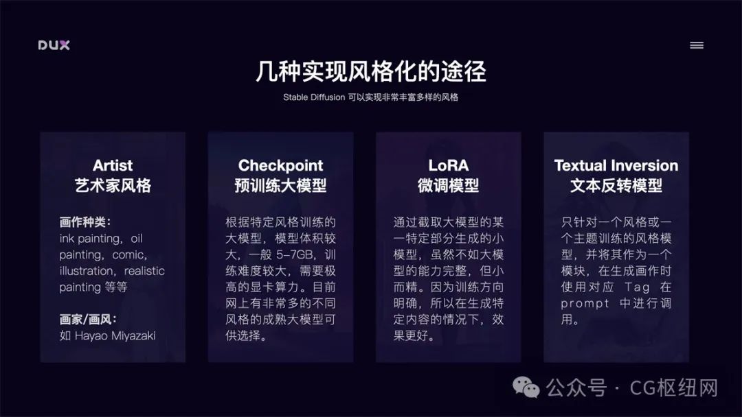 Stable Diffusion 实现图像风格化的途径主要有以下几种:Artist 艺术家风格、Checkpoint 预训练大模型、LoRA 微调模型、Textual Inversion 文本反转模型。