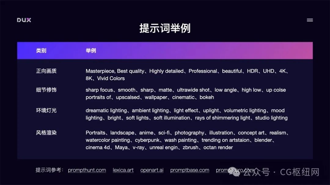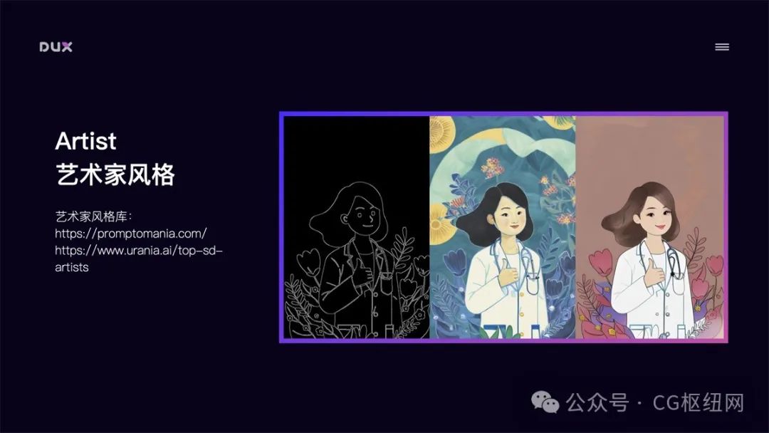 主要通过画作种类 Tag(如:oil painting、ink painting、comic、illustration),画家/画风 Tag(如:Hayao Miyazaki、Cyberpunk)等控制图像风格。网上也有比较多的这类风格介绍,如: