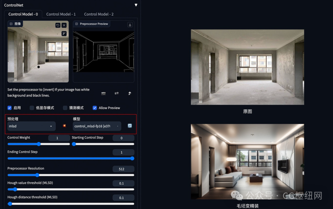 方法:通过 ControlNet 的 MLSD 模型提取建筑的线条结构和几何形状,构建出建筑线框(可提取参考图线条,或者手绘线条),再配合提示词和建筑/室内设计风格模型来生成图像。
