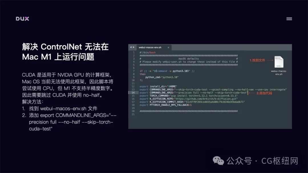 对于 Mac M1 芯片的电脑来说,直接运行 ControlNet 会报错,导致无法使用 ControlNet。原因是 CUDA 是适用于 NVIDIA GPU 的计算框架,当前 Mac OS 无法使用此框架,因此脚本会尝试使用 CPU,但 M1 不支持半精度数字。因此我们需要跳过 CUDA 并使用 no-half。