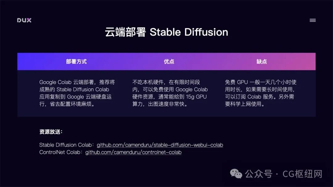 通过 Google Colab 进行云端部署,推荐将成熟的 Stable Diffusion Colab 项目复制到自己的 Google 云端硬盘运行,省去配置环境麻烦。这种部署方式的优点是:不吃本机硬件,在有限时间段内,可以免费使用 Google Colab 强大的硬件资源,通常能给到 15G 的 GPU 算力,出图速度非常快。缺点是:免费 GPU 使用时长不固定,通常情况下一天有几个小时的使用时长,如果需要更长时间使用,可以订阅 Colab 服务。