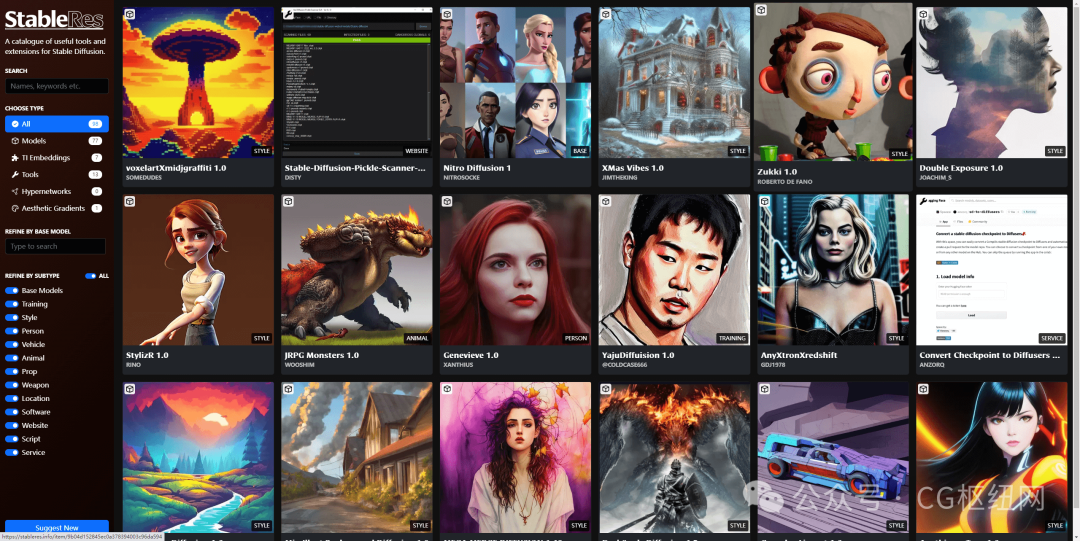 直接从Hugging Face中找模型肯定没有头绪,要是能直接像C站看效果图选模型就好了,欸嘿,这个网站就能满足。该网站的大多数模型都是来自Hugging Face。