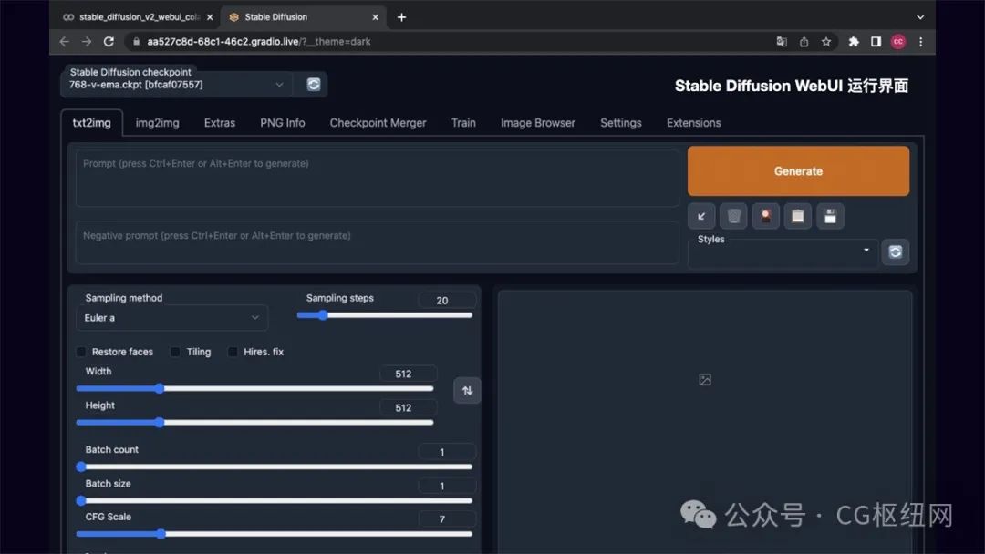 在浏览器中打开 http://127.0.0.1:7860 ,即可运行 Stable Diffusion WebUI