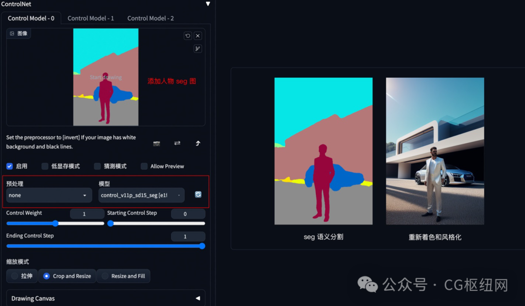 如果还想在车前面加一个人,只需在 Seg 预处理图上对应人物色值,添加人物色块再生成图像即可。