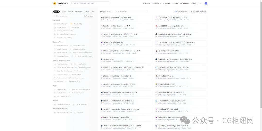 Huggin Face(抱抱脸)是一个允许用户共享机器学习模型和数据集,拥有海量但不限于Stable Diffusion模型的开源平台。这里有许多最新发布的Stable Diffusion通用基础模型。此外还有许多用户自己训练上传的底模或者Lora,感兴趣可以自己探索。