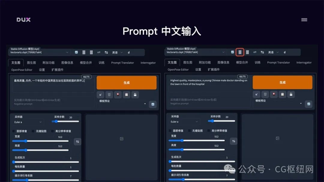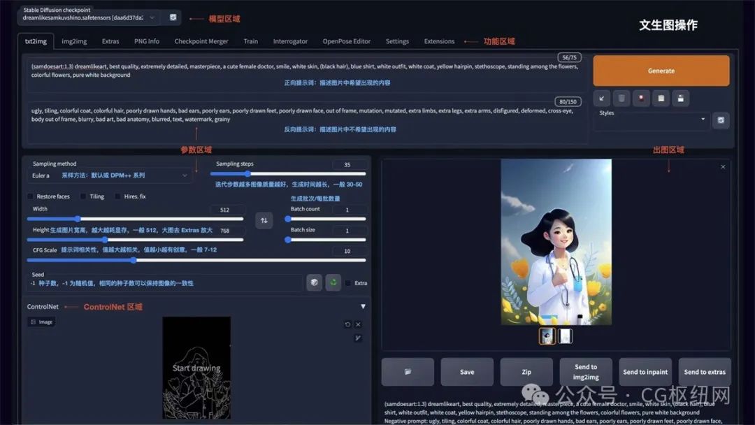 如图所示 Stable Diffusion WebUI 的操作界面主要分为:模型区域、功能区域、参数区域、出图区域。