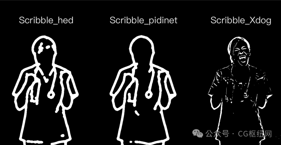 Scribble 比 Canny、SoftEdge 和 Lineart 的自由发挥度要更高,也可以用于对手绘稿进行着色和风格处理。Scribble 的预处理器有三种模式:Scribble_hed,Scribble_pidinet,Scribble_Xdog,对比如下,可以看到 Scribble_Xdog 的处理细节更为丰富: