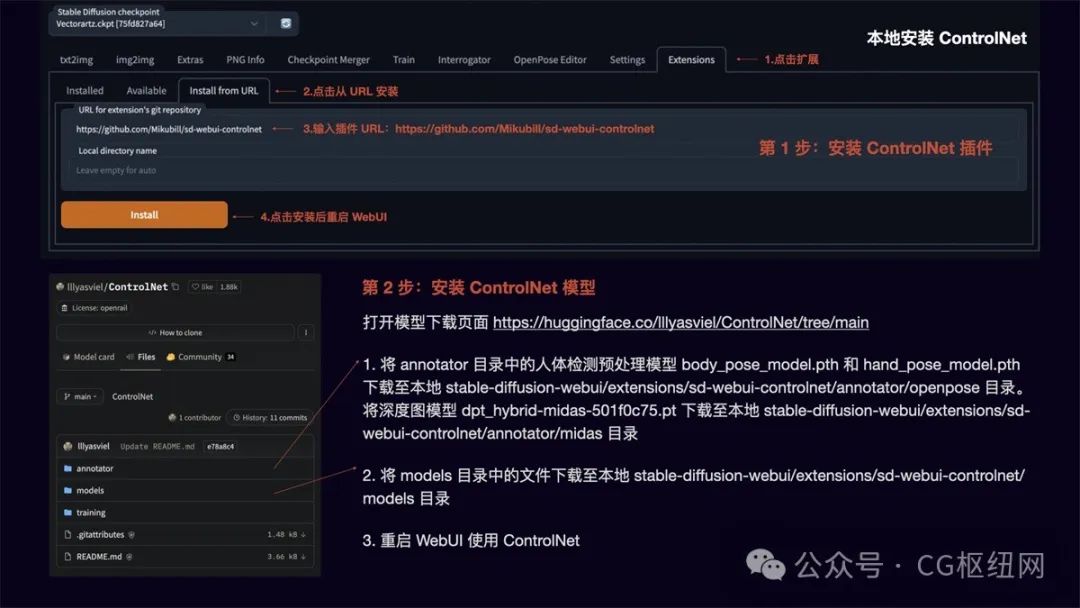 点击扩展,选择从 URL 安装,输入插件地址 https://github.com/Mikubill/sd-webui-controlnet ,点击 Install 后重启 WebUI。