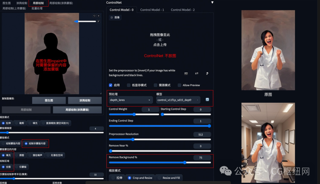 要点:如果想要比较完美的替换背景,可以在图生图的 Inpaint 模式中,对需要保留的图片内容添加蒙版,remove background 值可以设置在 70-80%。