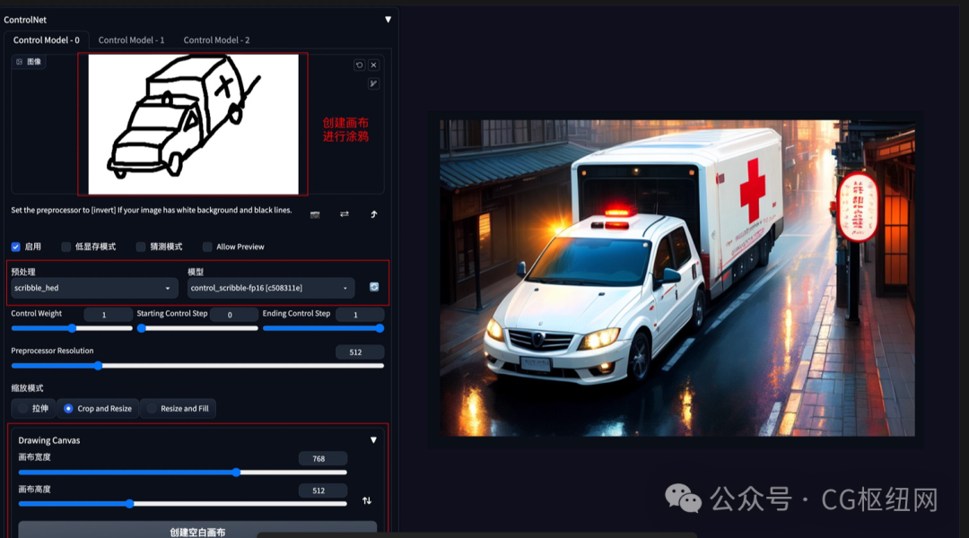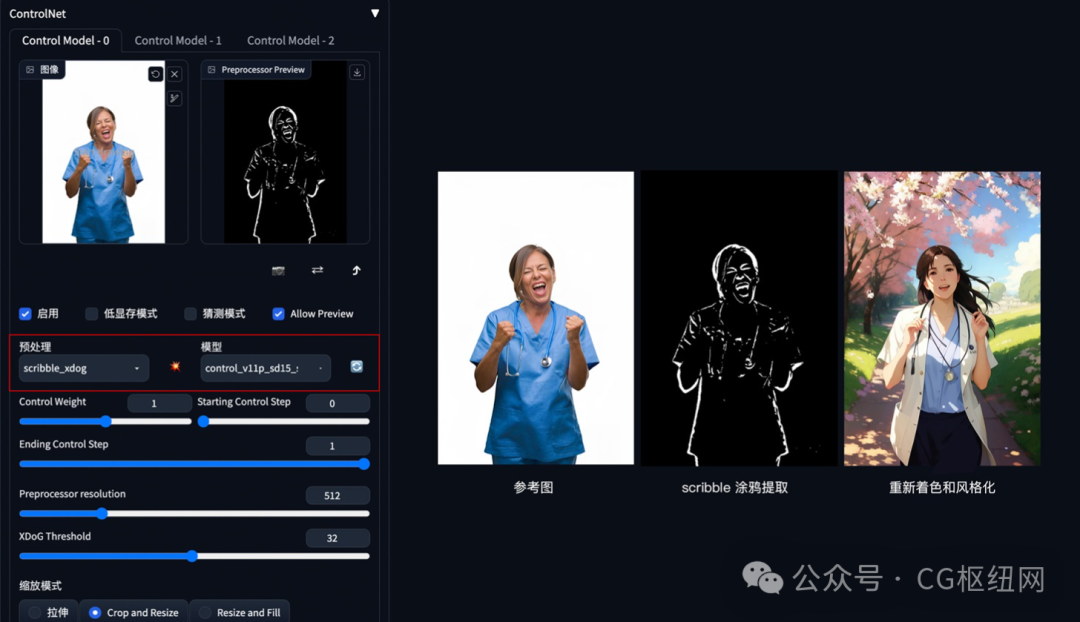 方法:通过 ControlNet 的 Scribble 模型提取涂鸦图(可提取参考图涂鸦,或者手绘涂鸦图),再根据提示词和风格模型对图像进行着色和风格化。