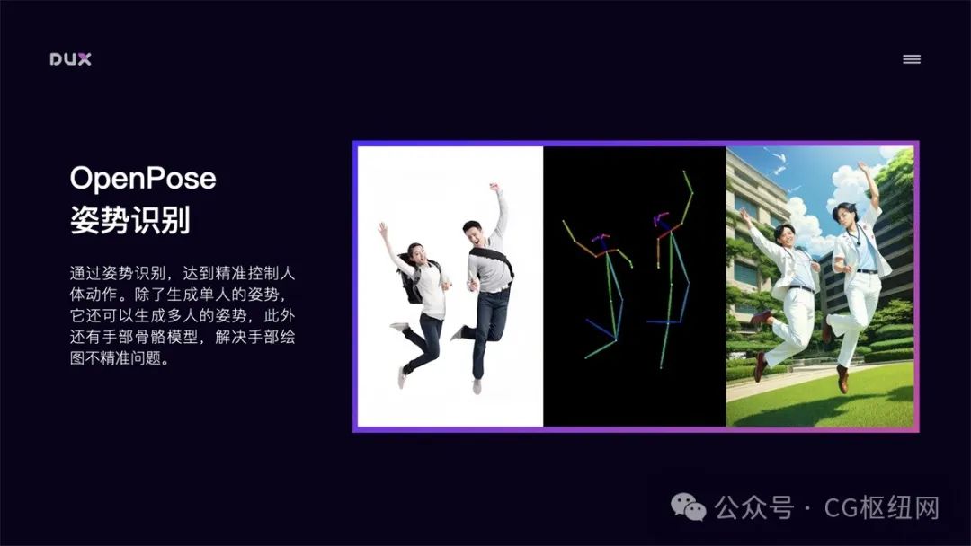 通过姿势识别,达到精准控制人体动作。除了生成单人的姿势,它还可以生成多人的姿势,此外还有手部骨骼模型,解决手部绘图不精准问题。以下图为例:左侧为参考图像,经 OpenPose 精准识别后,得出中间的骨骼姿势,再用文生图功能,描述主体内容、场景细节和画风后,就能得到一张同样姿势,但风格完全不同的图。