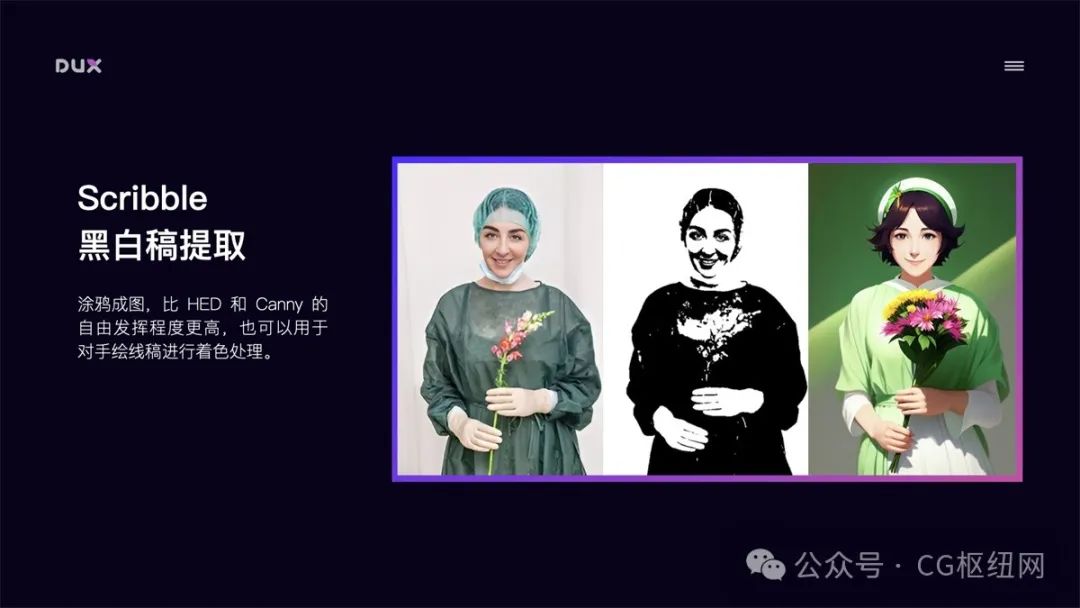 涂鸦成图,比 HED 和 Canny 的自由发挥程度更高,也可以用于对手绘线稿进行着色处理。
