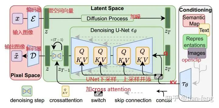 我们现在再来看这张图,除了Unet我没讲(下面会单独介绍),是不是简单多了,最左边不就是像素空间的编码器解码器,最右边就是clip把文本变成文本向量,中间上面的就是加噪,下面就是Unet预测噪声,然后不停的采样解码得到输出图像。这是原论文采样图,没画训练过程。