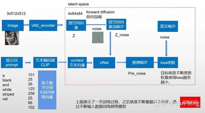 首先,我会画一个简化模型图对标原图,以方便理解。让我们从训练阶段开始,可能你们发现少了VAEdecoder,这是因为我们训练过程是在潜空间完成,decoder我们放在第二阶段采样阶段说,我们所使用的stablediffusion webui画图通常是在采样阶段,至于训练阶段,目前我们大多数普通人是根本完成不了的,它所需要训练时间应该可以用GPUyear来计量,(单V100的GPU要一年时间),如果你有100张卡,应该可以一个月完成。至于ChatGPT光电费上千万美金,上万GPU集群,感觉现在AI拼的就是算力。又扯远了,come back。