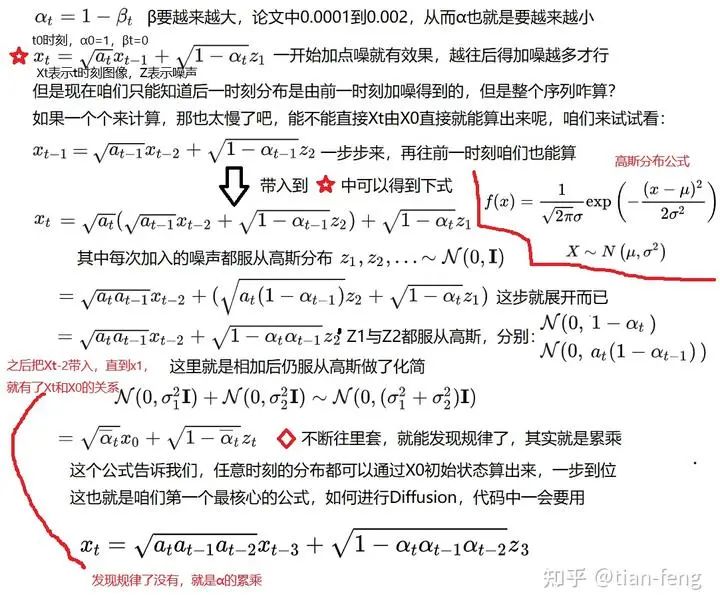 第二,图像加噪是符合高斯分布的,也就是在潜空间向量加的噪声是符合均值为0,方差为1的,将Xt-1带入Xt中,为什么两项可以合并,因为Z1Z2都是符合高斯分布,那么他们相加Z2’也符合,并且它们的方差和为新的方差,所有把他们各自的方差求和,(那个带根号的是标准差),如果你无法理解,可以把它当做一个定理。在多说一句,对Z–>a+bZ,那么Z的高斯分别也从(0,σ)–>(a,bσ),现在我们得到了Xt跟Xt-2的关系