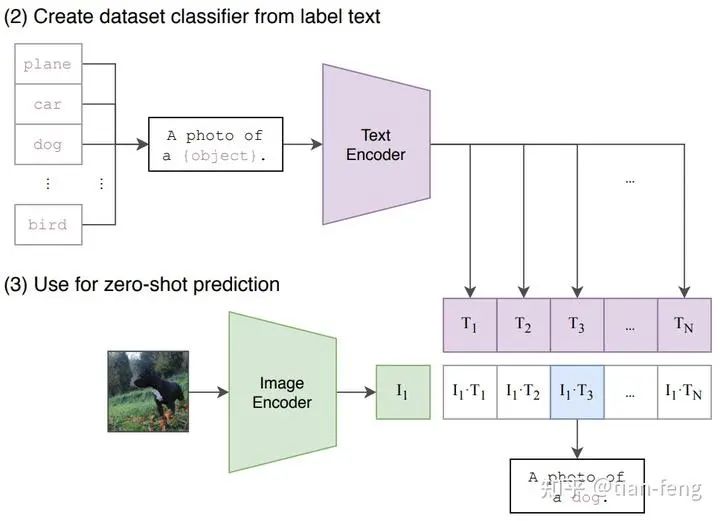随着模型的不断更新,在后续阶段,编码器对图像和文本编码得到的嵌入会逐渐相似。在整个数据集中重复该过程,并使用大batch size的编码器,最终能够生成一个嵌入向量,其中狗的图像和句子「一条狗的图片」之间是相似的。
