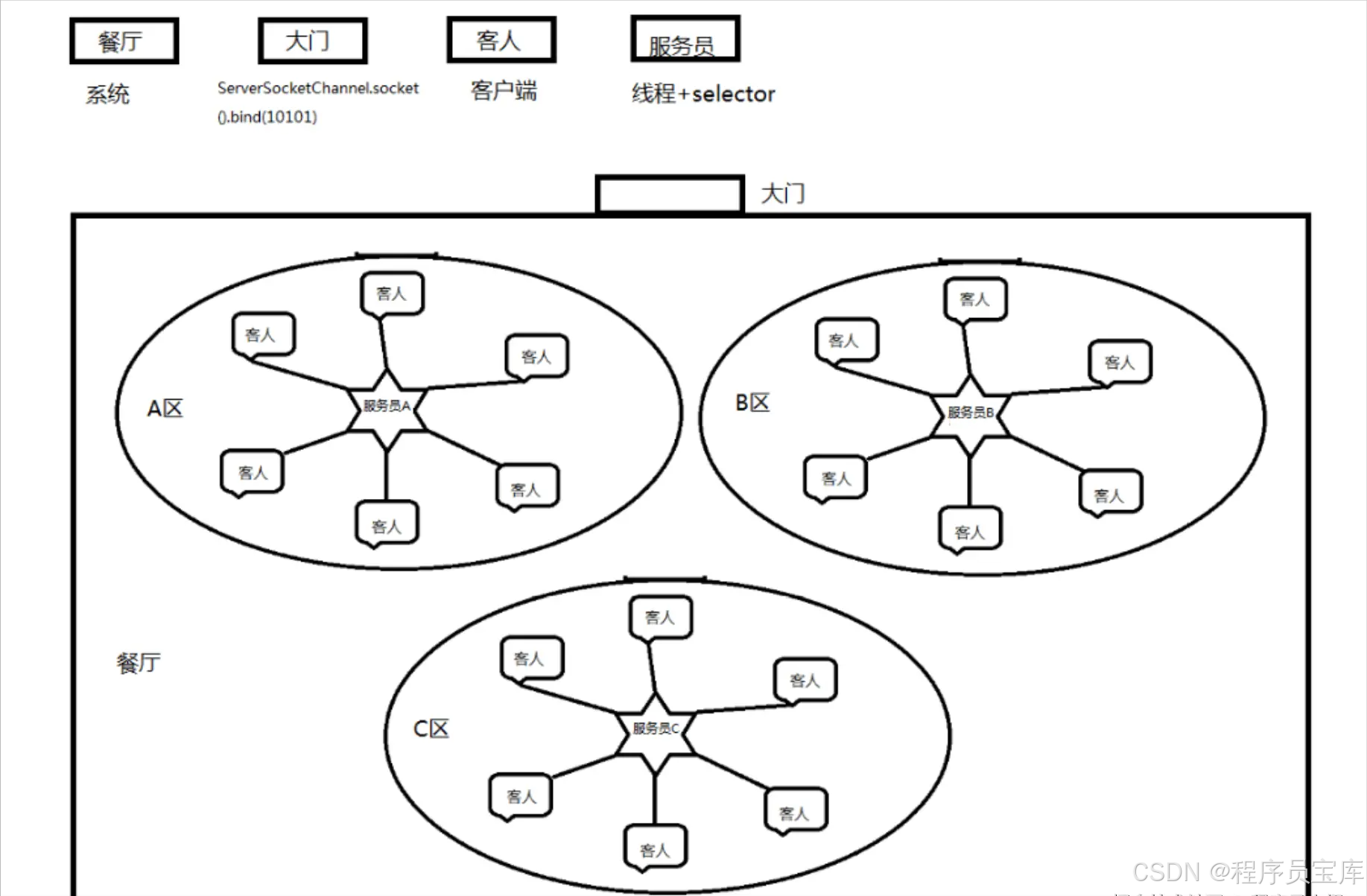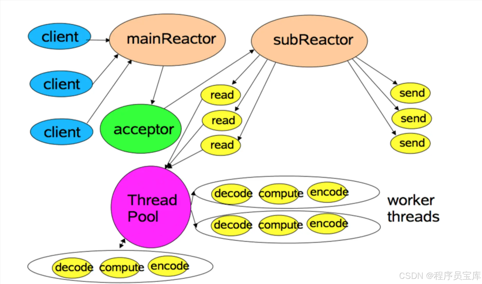 上图,简单地可以描述为”boss接活,让work干”:manReactor用来接收请求(会与客户端进行握手验证),而subReactor用来处理请求(不与客户端直接连接)。