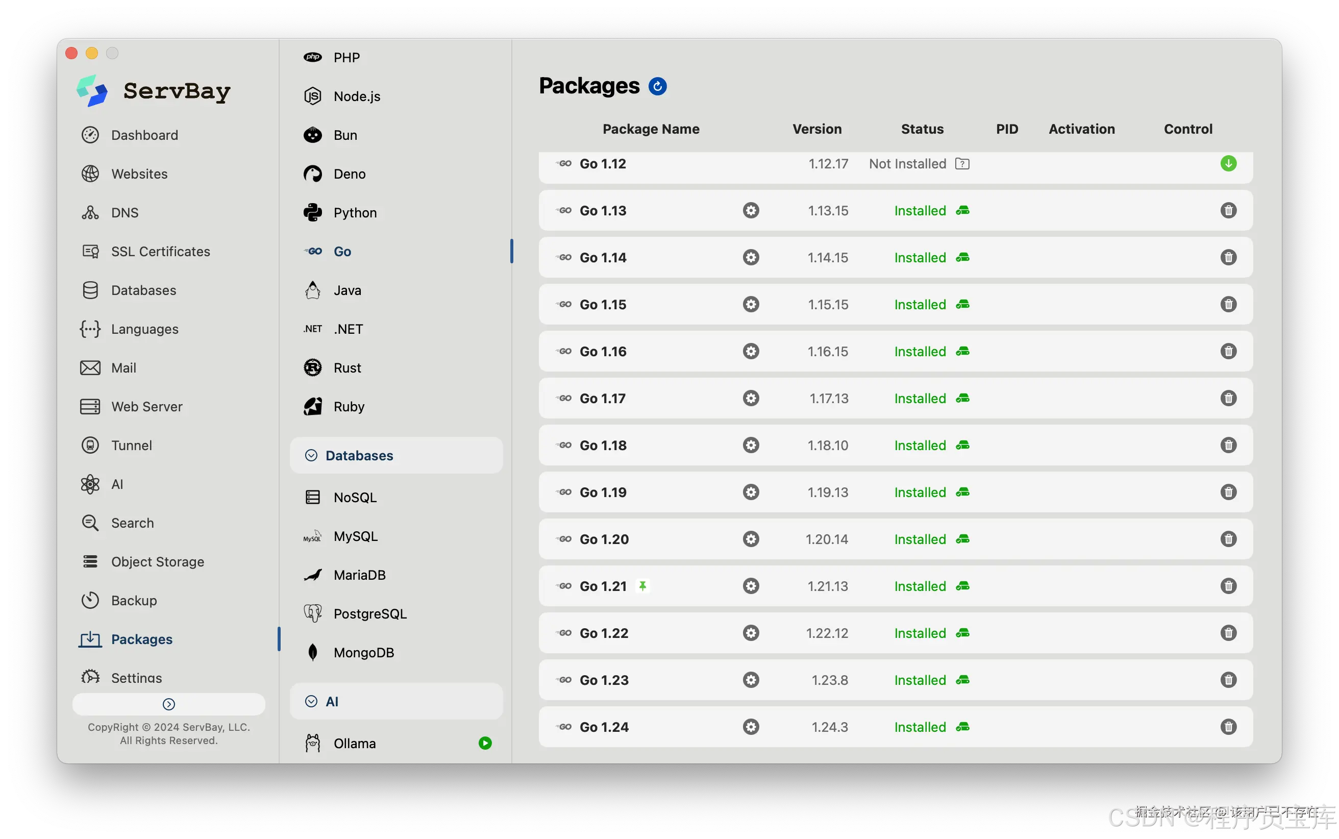 在开始之前,先介绍一个工具。写出优雅的代码,一个顺手的开发环境是基础。我自己现在用的是 ServBay,它给我最大的便利就是可以一键安装 Go 环境。特别是对于需要同时维护多个项目的开发者来说,ServBay 支持多个 Go 版本并存,互不干扰,切换起来非常方便。不用再手动配置 GOPATH、GOROOT 这些环境变量,省下了不少折腾的时间。