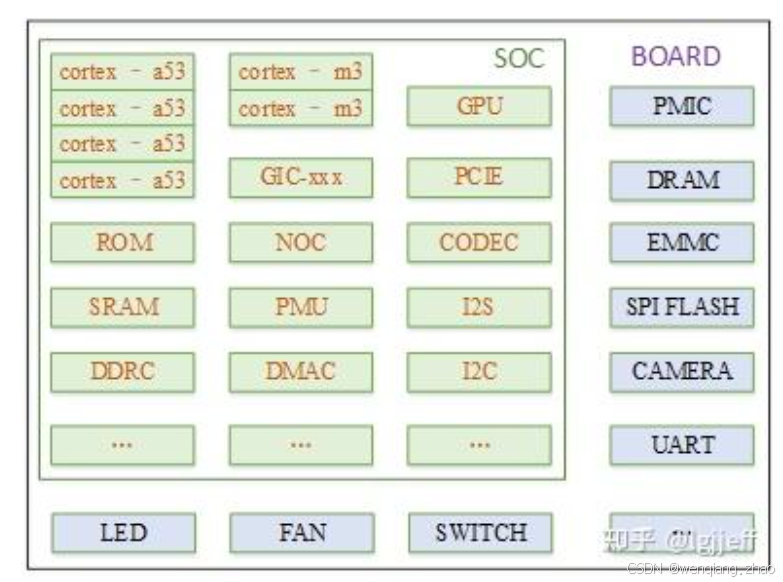 (2)SOC:它包含了cpu、总线控制器、集成在片内的rom、sram、dma控制器、硬件加速器、异构核,以及片内时钟、电源控制模块等