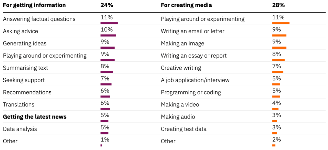 获取信息**:**包括回答事实问题(11%)、提供建议(10%)、产生想法(9%)和总结(8%)。