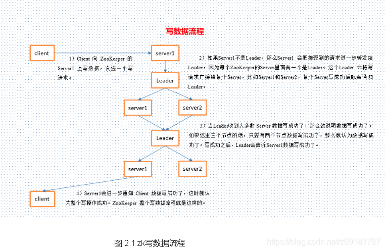 1)Zookeeper:一个领导者(leader),多个跟随者(follower)组成的集群。 2)Leader负责进行投票的发起和决议,更新系统状态。 3)Follower用于接收客户请求并向客户端返回结果,在选举Leader过程中参与投票。 4)集群中奇数台服务器只要有半数以上节点存活,Zookeeper集群就能正常服务。 5)全局数据一致:每个server保存一份相同的数据副本,client无论连接到哪个server,数据都是一致的。 6)更新请求顺序进行,来自同一个client的更新请求按其发送顺序依次执行。 7)数据更新原子姓,一次数据更新要么成功,要么失败。 8)实时姓,在一定时间范围内,client能读到最新数据。